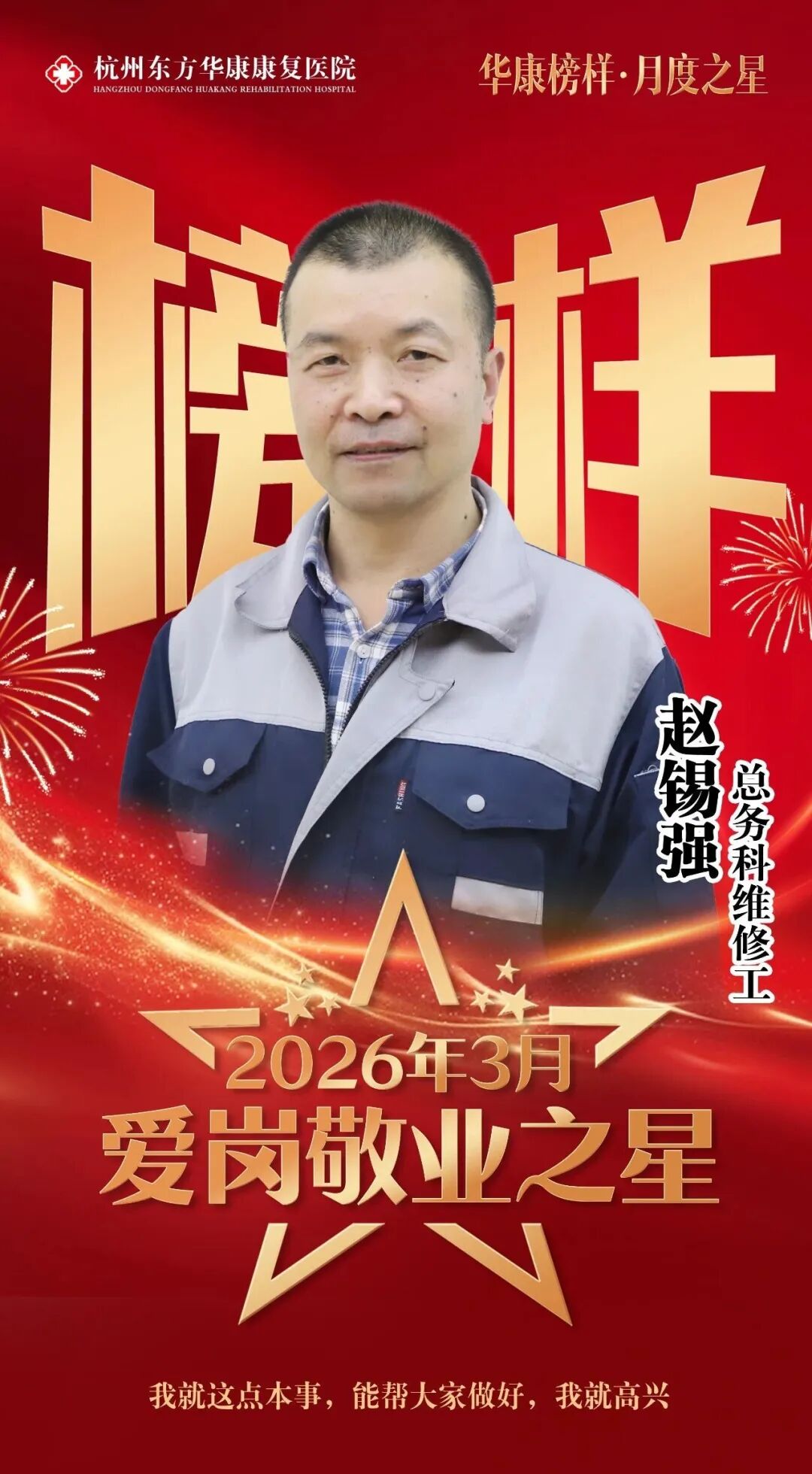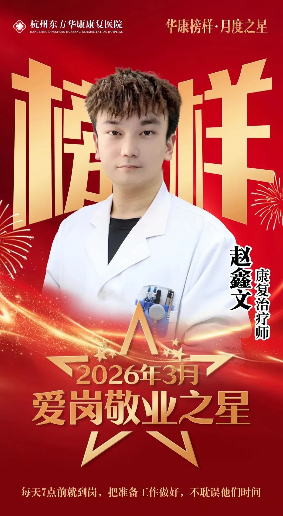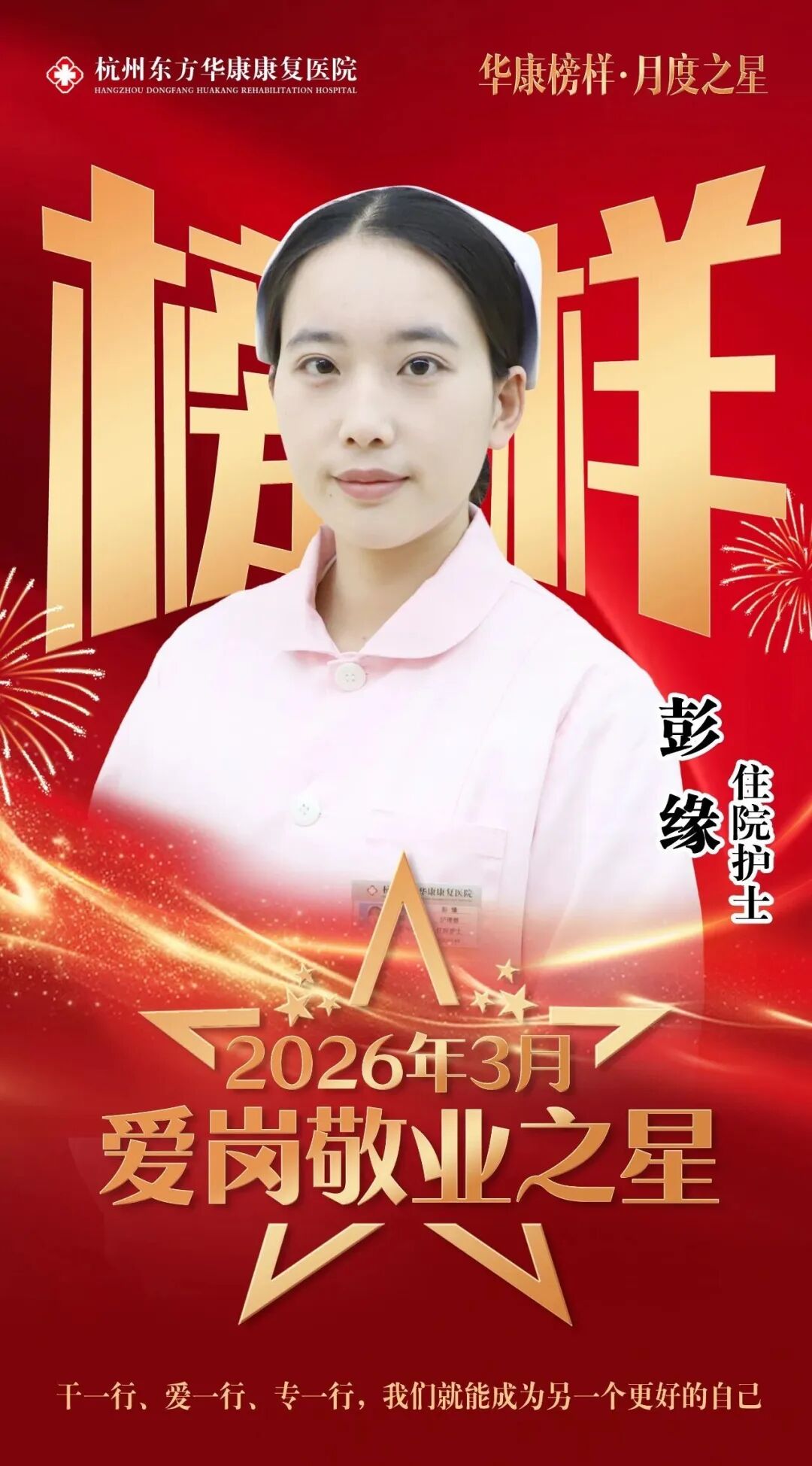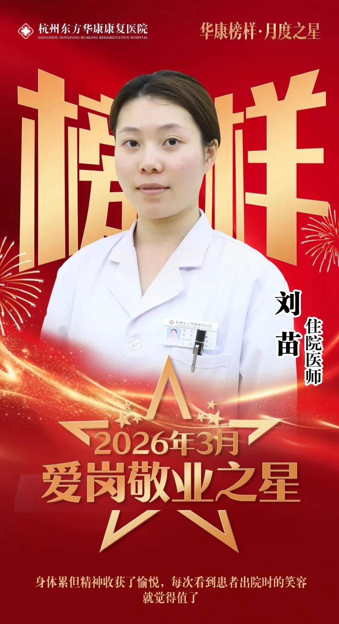 2026 年是东方华康医疗集团“三年服务内涵行动”深化之年。为弘扬敬业奉献精神、树立先进典型、激发全院职工干事创业热情,杭州东方华康康复医院开展“华康榜样・月度之星”评选活动。3 月,刘苗、彭缘、赵鑫文、赵锡强四位员工凭借扎实专业、责任担当与暖心服务,获评“爱岗敬业之星”,在平凡岗位上书写不凡坚守。